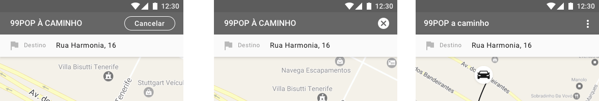 The cancel action was prominent and easy to reach with your thumbs. Obviously, making canceling harder could have the most significant impact, but at first glance, it's not the most user-friendly measure. However, 99 had two types of users: the passenger and the driver. The later was heavily impacted by easy cancellation. As I mentioned before, we didn't want to have cancellation fees, so we worked on some options to make the cancel action less prominent and highlight the driver communication first.